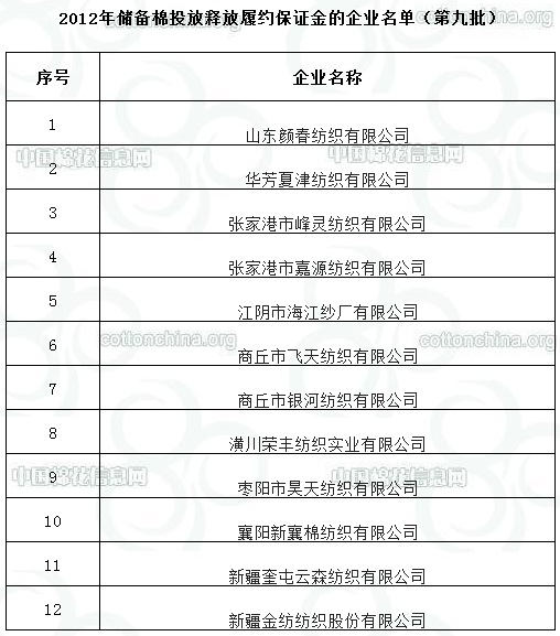 2012年儲備棉投放釋放履約保證金的企業(yè)名單(第九批)