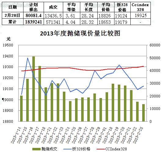2月28日儲備棉投放數(shù)量為80081.3584噸,實際成交13436.4717噸,成交比例16.78%,較前一交易日提高2.25%;當(dāng)日成交儲備棉平均等級為3.61,較前一交易日提高0.12;平均長度28.24,提高0.08;加權(quán)成交價18826元/噸,較上一日提高78元,折328級成交價為19124元/噸(公重),漲7元,比當(dāng)日CCIndex328價格低201元/噸。截止2月28日,累計上市總量1839241噸,累計成交總量571341噸,成交比例31.06%。