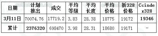 3月11日儲(chǔ)備棉投放數(shù)量為70074.7618噸,實(shí)際成交17719.168噸,成交比例25.29%,較前一交易日升高6.1%;當(dāng)日成交儲(chǔ)備棉平均等級(jí)為3.83,較前一交易日升高0.07;平均長度28.38,較前一交易日提高0.17;加權(quán)成交價(jià)18775元/噸,較上一日高11元,折328級(jí)成交價(jià)19172元/噸(公重),漲18元,比當(dāng)日CCIndex328價(jià)格低174元/噸。截止3月11日,累計(jì)上市總量2376319.942噸,累計(jì)成交總量698470.3316噸,成交比例29.39%。