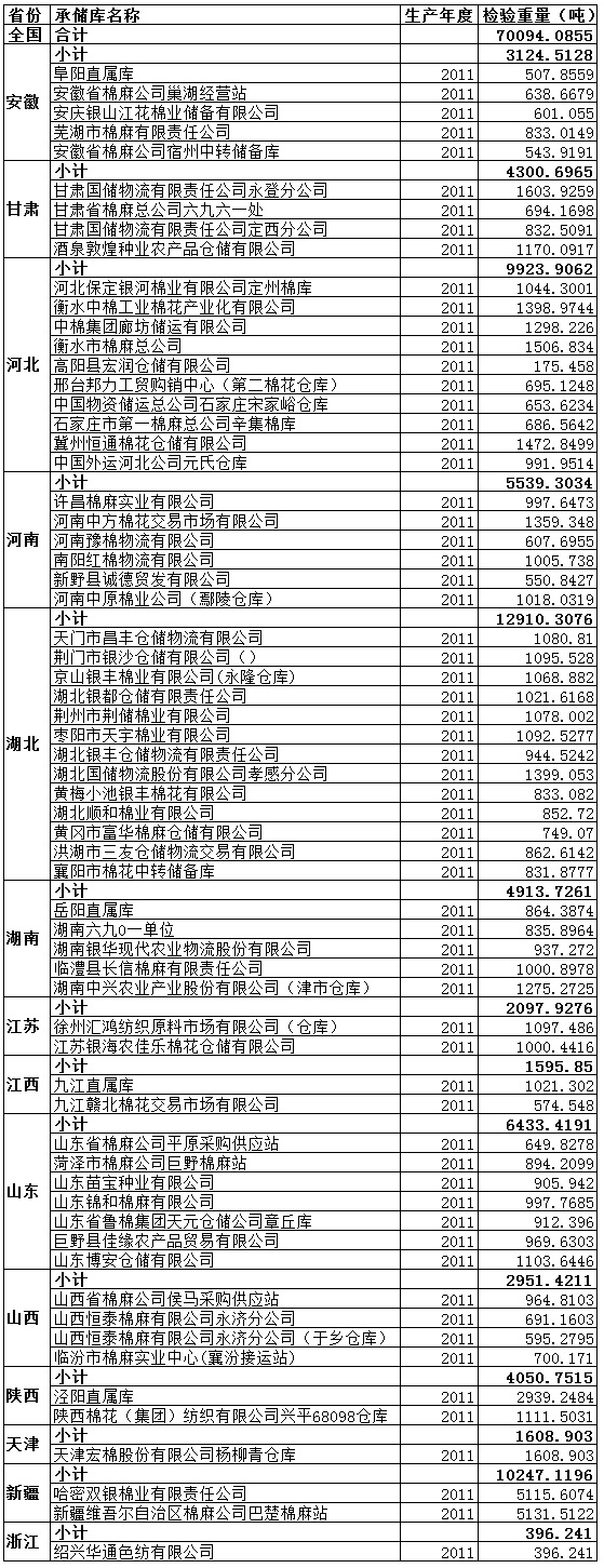 中國(guó)儲(chǔ)備棉管理總公司定于3月14日出庫(kù)銷售儲(chǔ)備棉70094.0855噸,相關(guān)批次公檢數(shù)據(jù)見(jiàn)附件。具體庫(kù)點(diǎn)如下: