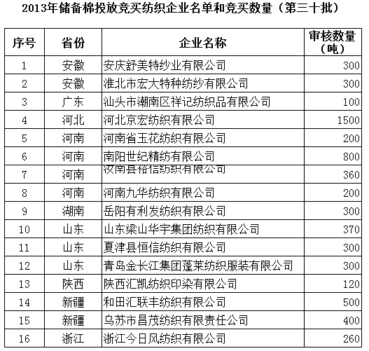 2013年儲備棉投放競買紡織企業(yè)名單和競買數(shù)量(第三十批)