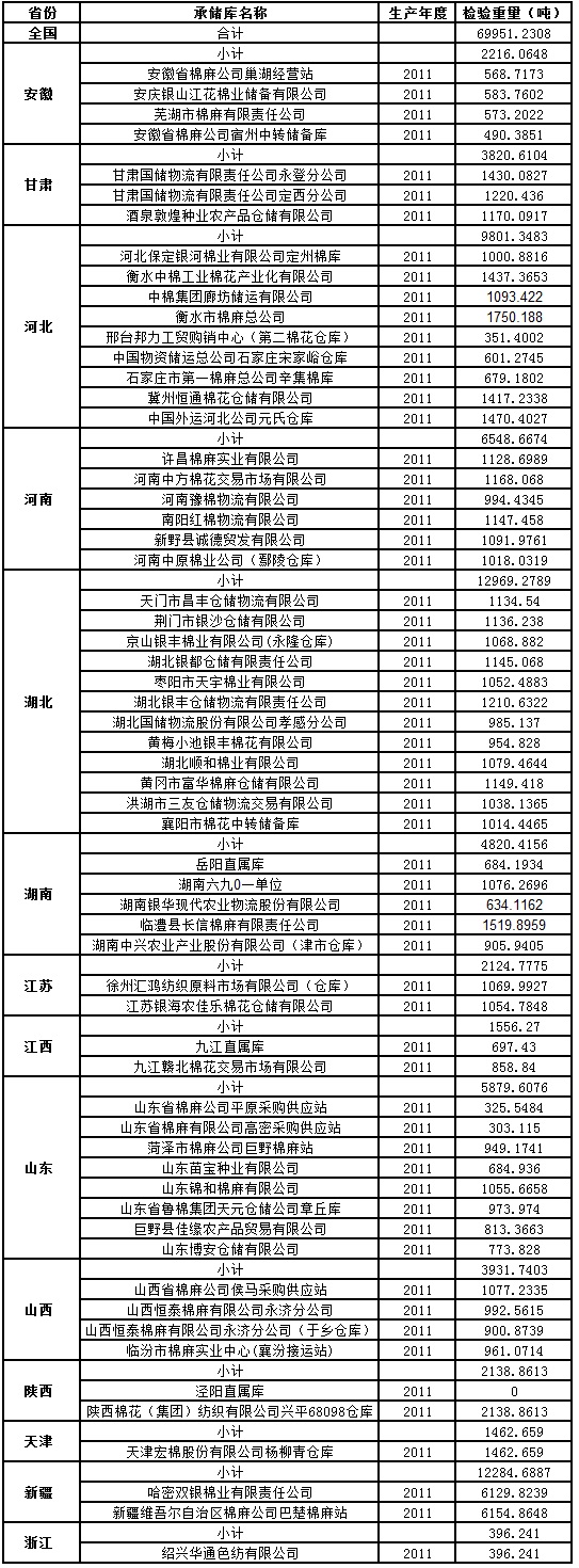 中國(guó)儲(chǔ)備棉管理總公司定于3月22日出庫(kù)銷售儲(chǔ)備棉69951.2308噸,相關(guān)批次公檢數(shù)據(jù)見(jiàn)附件。具體庫(kù)點(diǎn)如下: