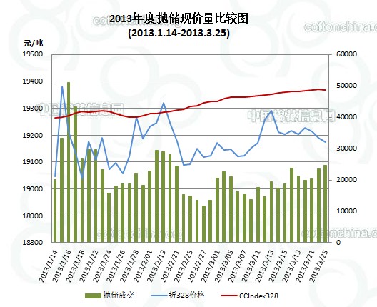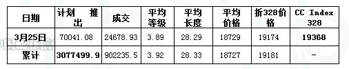 3月25日儲備棉投放數(shù)量為70041.08噸,實際成交24678.93噸,成交比例35.23%;當日成交儲備棉平均等級為3.89,較前一交易日降低0.08;平均長度28.29,較前一交易日降低0.02;加權(quán)成交價18729元/噸,較上一交易日降64元/噸,折328級成交價19174元/噸(公重),降16元/噸,比當日CCIndex328價格低194元/噸。截止3月25日,累計上市總量3077499.88噸,累計成交總量902235.45噸,成交比例29.32%。