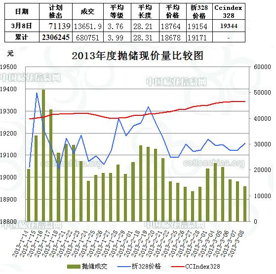 3月8日儲備棉投放數(shù)量為71138.5687噸,實(shí)際成交13651.9232噸,成交比例19.19%,較前一交易日降低1.25%;當(dāng)日成交儲備棉平均等級為3.76,較前一交易日降低0.09;平均長度28.21,提高0.02;加權(quán)成交價(jià)18764元/噸,較上一日低19元,折328級成交價(jià)19154元/噸(公重),漲30元,比當(dāng)日CCIndex328價(jià)格低190元/噸。截止3月8日,累計(jì)上市總量2306245噸,累計(jì)成交總量680751噸,成交比例29.5%。