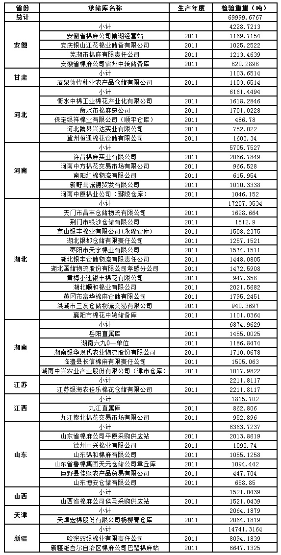 中國儲備棉管理總公司定于4月15日出庫銷售儲備棉69999.6767噸,相關(guān)批次公檢數(shù)據(jù)見附件。具體庫點(diǎn)如下: