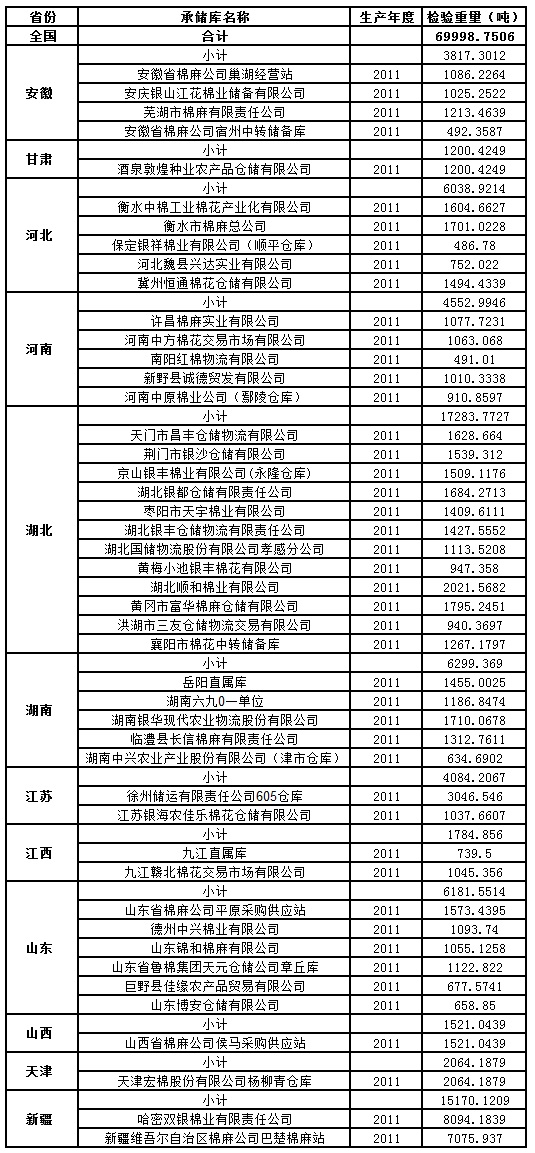 中國儲備棉管理總公司定于4月16日出庫銷售儲備棉69998.7506噸,相關批次公檢數據見附件。具體庫點如下: