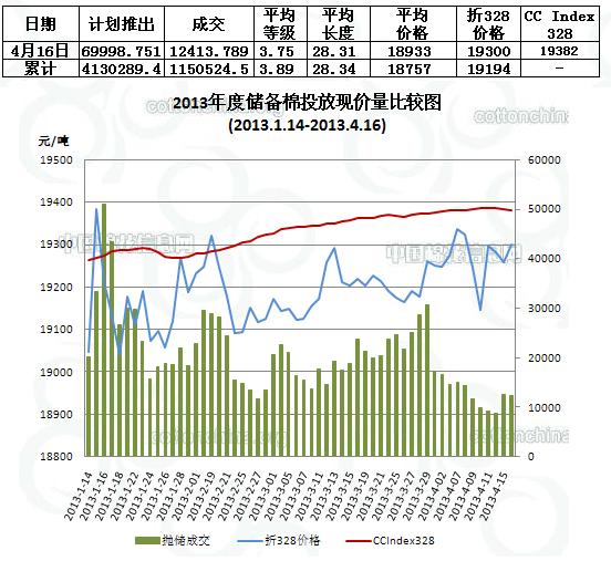 4月16日儲(chǔ)備棉投放數(shù)量為69998.7506噸,實(shí)際成交12413.7887噸,成交比例17.73%,較上一交易日降0.14%;當(dāng)日成交儲(chǔ)備棉平均等級(jí)為3.75,較上一日提高0.10;平均長度28.31,降0.09;加權(quán)成交價(jià)18933元/噸,較上一交易日提高77元/噸,折328級(jí)成交價(jià)19300元/噸(公重),提高42元/噸,比當(dāng)日CCIndex328價(jià)格低82元/噸。截止4月16日,累計(jì)上市總量4130289.446噸,累計(jì)成交總量1150524.504噸,成交比例27.86%。