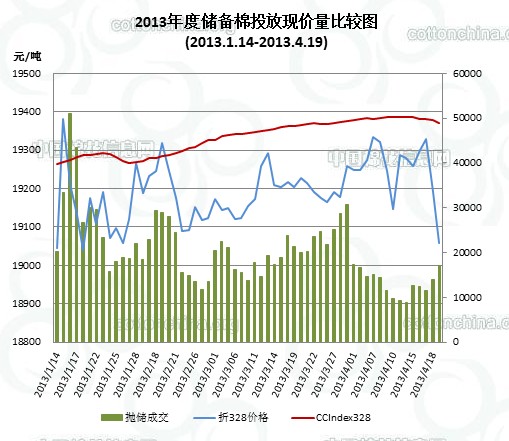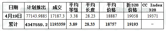4月19日儲(chǔ)備棉投放數(shù)量為77143.9885噸,實(shí)際成交17187.3265噸,成交比例22.28%;其中成交2012年度棉花6423.3647噸,成交2011年度棉花10763.9618噸。當(dāng)日成交儲(chǔ)備棉平均等級(jí)為3.38,較上一日高0.81;平均長(zhǎng)度28.23,長(zhǎng)0.10;加權(quán)成交價(jià)18887元/噸,較上一交易日高335元/噸,折328級(jí)成交價(jià)19058元/噸(公重),降低132元/噸,比當(dāng)日CCIndex328價(jià)格低313元/噸。截止4月19日,累計(jì)上市總量4347559.207噸,累計(jì)成交總量1193359.311噸,成交比例27.45%。