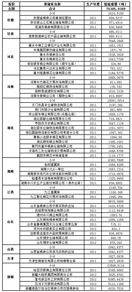 中國儲備棉管理總公司定于4月22日出庫銷售儲備棉75305.9309噸,相關(guān)批次公檢數(shù)據(jù)見附件。具體庫點如下: