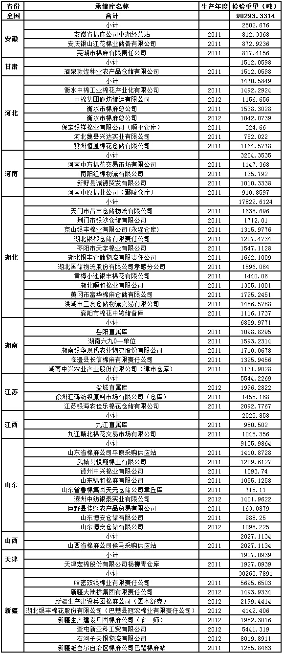 中國(guó)儲(chǔ)備棉管理總公司定于4月23日出庫(kù)銷(xiāo)售儲(chǔ)備棉90293.3314噸,相關(guān)批次公檢數(shù)據(jù)見(jiàn)附件。具體庫(kù)點(diǎn)如下: