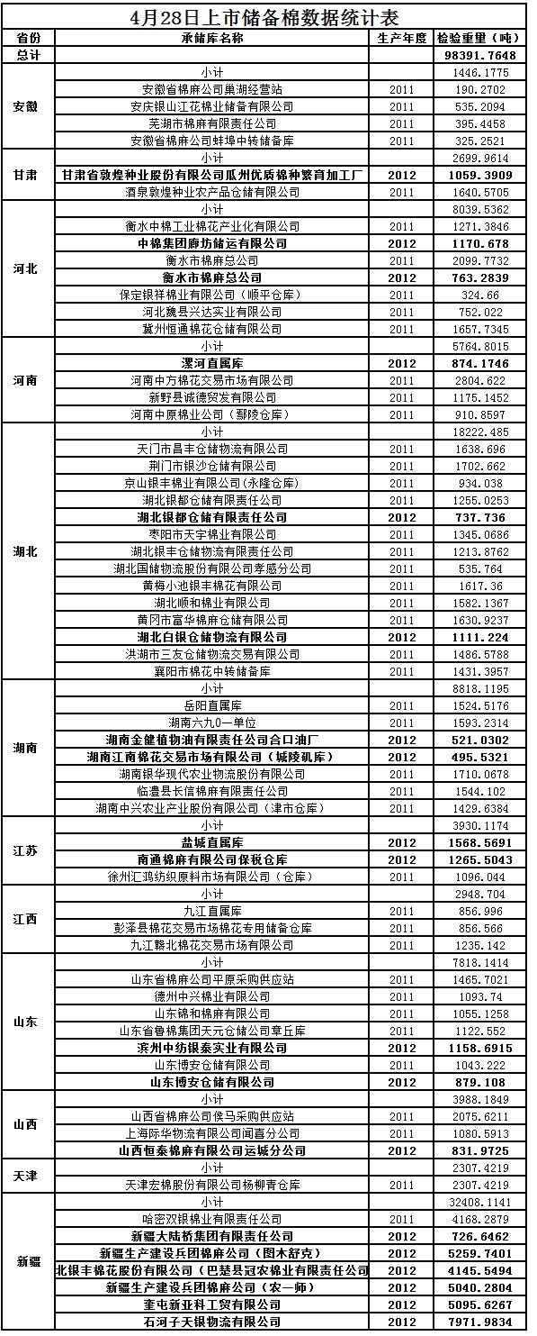 中國儲(chǔ)備棉管理總公司定于4月28日出庫銷售儲(chǔ)備棉98391.7648噸,相關(guān)批次公檢數(shù)據(jù)見附件。具體庫點(diǎn)如下: