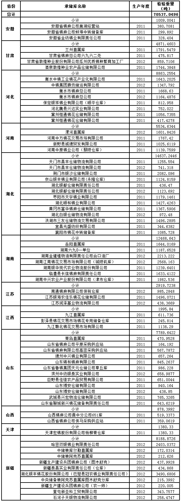 中國儲備棉管理總公司定于5月21日出庫銷售儲備棉70537.0496噸,相關批次公檢數(shù)據(jù)見附件。具體庫點如下: