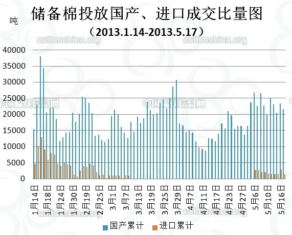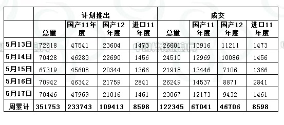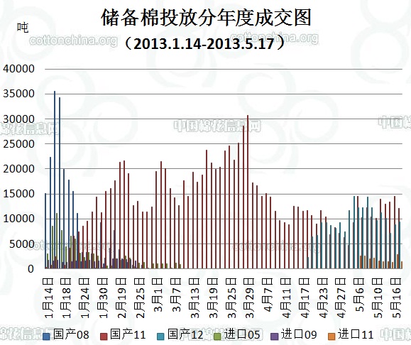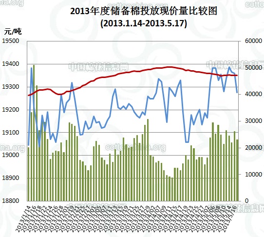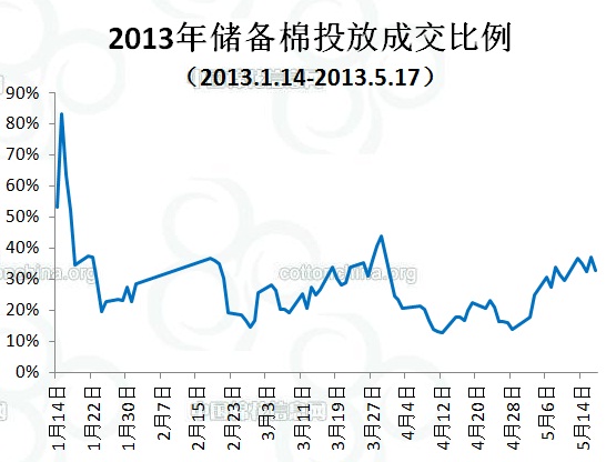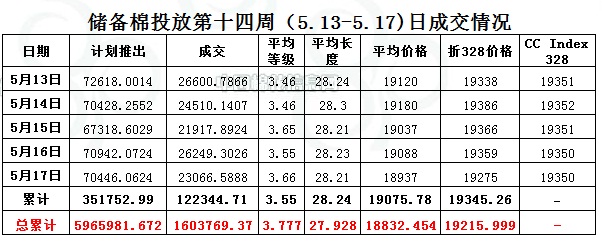 上周(5.13-5.17)累計(jì)投放儲(chǔ)備棉351752.9943噸,實(shí)際成交122344.7111噸,成交比例34.78%;當(dāng)周成交儲(chǔ)備棉平均等級(jí)為3.55,平均長(zhǎng)度28.24,加權(quán)成交價(jià)19076元/噸,折328級(jí)成交價(jià)19345元/噸(公重)。截止上周,2013年以來(lái)累計(jì)上市投放儲(chǔ)備棉5965981.6722噸,累計(jì)成交總量1603769.367噸,成交比例26.88%。