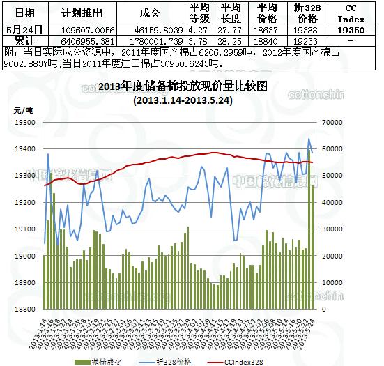 5月24日儲(chǔ)備棉投放數(shù)量為109607.0056噸,實(shí)際成交46159.8039噸,成交比例42.11%,較昨日降低9.61%;其中2011年度國(guó)產(chǎn)棉花成交6206.2959噸,2011年度進(jìn)口棉成交30950.6243噸,2012年度國(guó)產(chǎn)棉花成交9002.8837噸。當(dāng)日成交儲(chǔ)備棉平均等級(jí)為4.27,較上一交易日降低0.49;平均長(zhǎng)度27.77,較前一交易日降低0.14;加權(quán)成交價(jià)18637元/噸,較上一交易日降339元/噸;折328級(jí)成交價(jià)19388元/噸(公重),較前一交易日降51元/噸,比當(dāng)日CCIndex328價(jià)格高38元/噸。截止5月24日,累計(jì)上市總量6406955.381噸,累計(jì)成交總量1780001.739噸,成交比例27.78%。