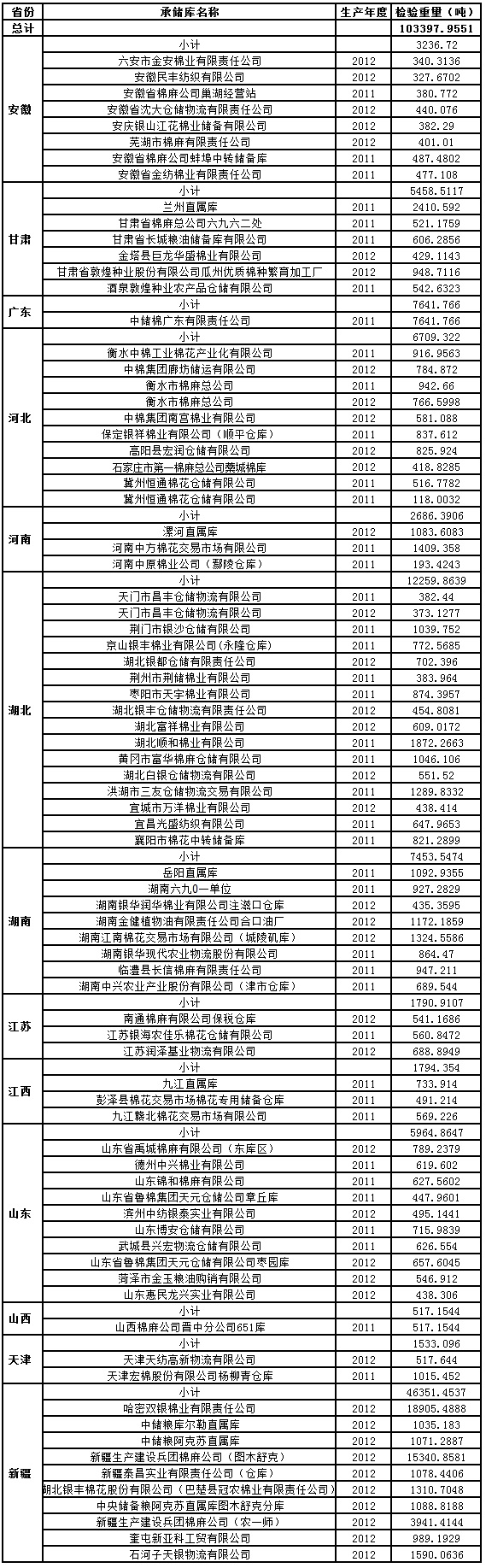 中國儲備棉管理總公司定于5月27日出庫銷售儲備103397.9551噸,其中進口棉7759.7692噸。相關(guān)批次公檢數(shù)據(jù)見附件。具體庫點如下: