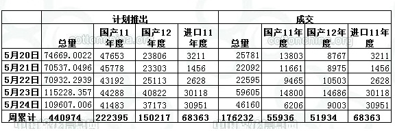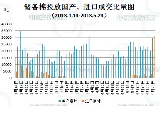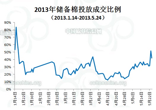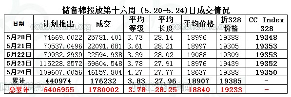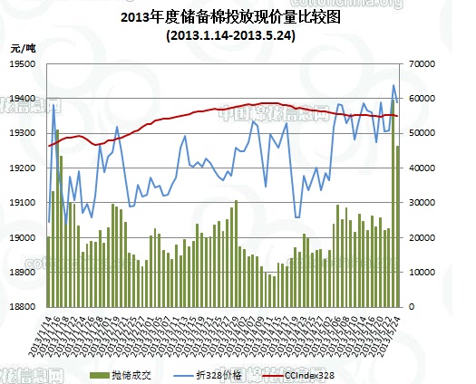 上周(5.20-5.24)累計投放儲備棉440974噸,實際成交176232噸,成交比例40%;當周成交儲備棉平均等級為3.83,平均長度27.96,加權(quán)成交價18907元/噸,折328級成交價19385元/噸(公重)。截止上周,2013年以來累計上市投放儲備棉6406955噸,累計成交總量1780002噸,成交比例27.78%。