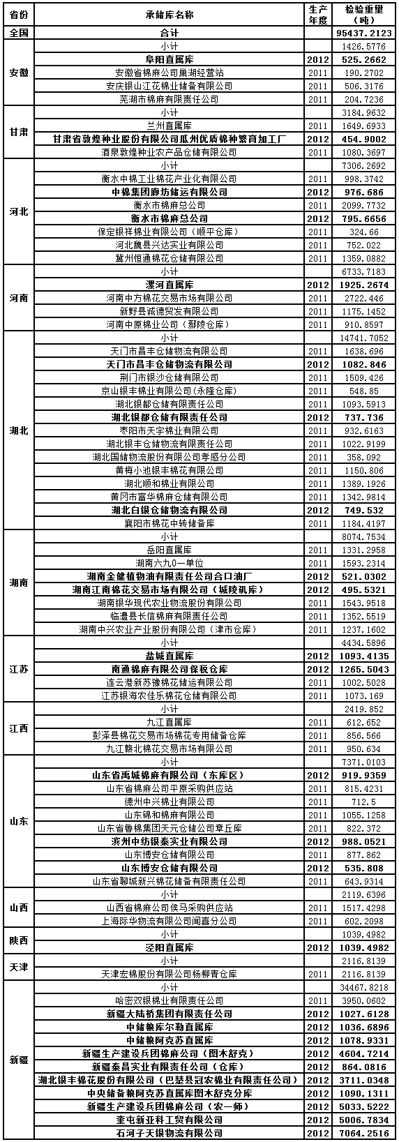 中國(guó)儲(chǔ)備棉管理總公司定于5月3日出庫(kù)銷(xiāo)售儲(chǔ)備棉95437.2123噸,相關(guān)批次公檢數(shù)據(jù)見(jiàn)附件。具體庫(kù)點(diǎn)如下: