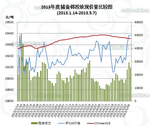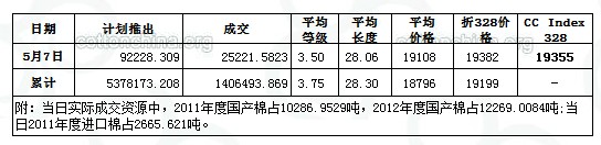 5月7日儲備棉投放數(shù)量為92228.309噸,實際成交25221.5823噸,成交比例27.35%,較上一交易日下降3.22個百分點;其中成交2011年度棉花10286.9529噸,成交2012年度棉花12269.0084噸;當(dāng)日2011年度2665.621噸進口棉全部成交。當(dāng)日成交儲備棉平均等級為3.5,較上一交易日升高0.1;平均長度28.06,較前一交易日下降0.11;加權(quán)成交價19108元/噸,較上一交易日下降76元/噸;折328級成交價19382元/噸(公重),較前一交易下降1元/噸,比當(dāng)日CCIndex328價格低27元/噸。截止5月7日,累計上市總量5378173.208噸,累計成交總量1406493.869噸,成交比例26.15%。