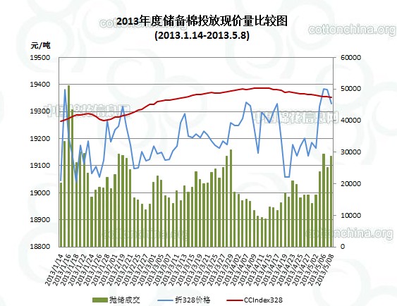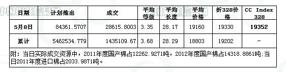 5月8日儲(chǔ)備棉投放數(shù)量為84361.5707噸,實(shí)際成交28615.8003噸,成交比例33.92%,較上一交易日上升6.57個(gè)百分點(diǎn);其中成交2011年度棉花12262.9271噸,成交2012年度棉花14318.8861噸;當(dāng)日2011年度2033.9871噸進(jìn)口棉全部成交。當(dāng)日成交儲(chǔ)備棉平均等級(jí)為3.35,較上一交易日升高0.15;平均長(zhǎng)度28.17,較前一交易日長(zhǎng)0.11;加權(quán)成交價(jià)19160元/噸,較上一交易日上調(diào)52元/噸;折328級(jí)成交價(jià)19330元/噸(公重),較前一交易下降52元/噸,比當(dāng)日CCIndex328價(jià)格低22元/噸。截止5月8日,累計(jì)上市總量5462534.779噸,累計(jì)成交總量1435109.67噸,成交比例26.27%。