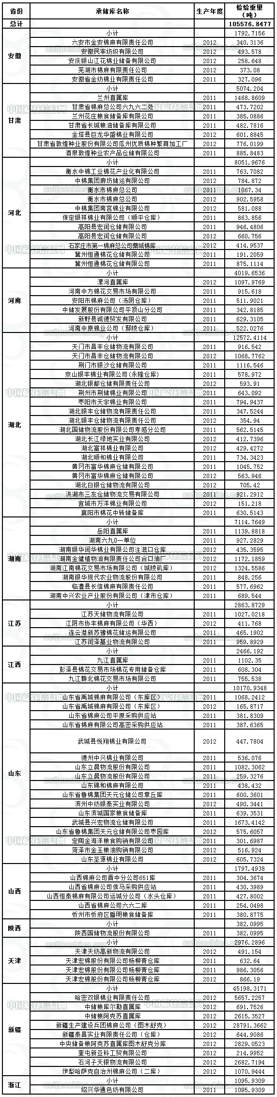 中國(guó)儲(chǔ)備棉管理總公司定于6月13日出庫(kù)銷售儲(chǔ)備105576.8477噸。其中,2011年度國(guó)產(chǎn)棉33267.6223噸,2012年度國(guó)產(chǎn)棉64267.9348噸,2011年度進(jìn)口棉8041.2906噸。相關(guān)批次公檢數(shù)據(jù)見附件。具體庫(kù)點(diǎn)如下: