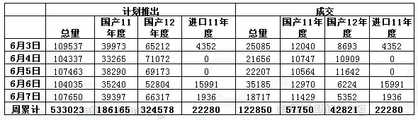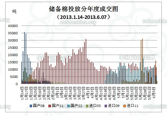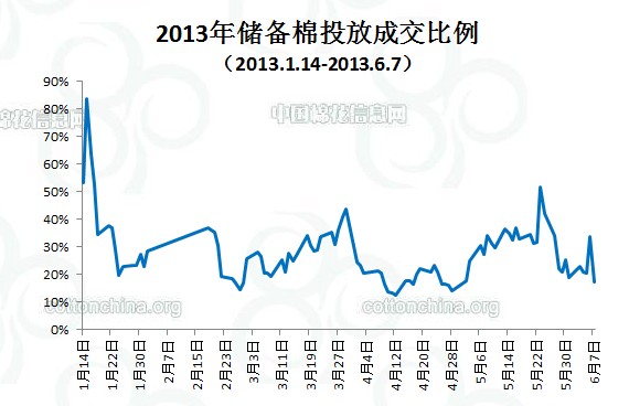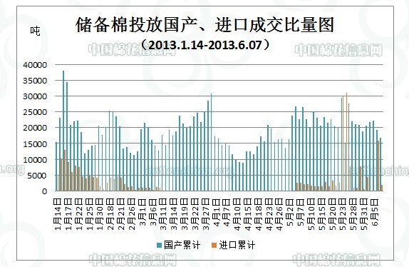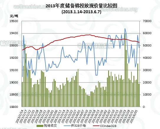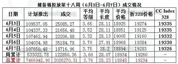 上周(6.03-6.07)累計(jì)投放儲備棉533023噸,實(shí)際成交122850噸,成交比例23.05%;當(dāng)周成交儲備棉平均等級為3.60,平均長度28.07,加權(quán)成交價18934元/噸,折328級成交價19260元/噸(公重)。截止6月7日,2013年以來累計(jì)上市投放儲備棉7466923噸,累計(jì)成交總量2026268噸,成交比例27.14%。