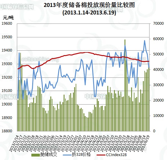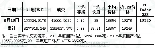 6月19日儲備棉投放數(shù)量為103024.9176噸,實際成交41666.5623噸,成交比例40.44%,較上一交易日增加1.86%,其中2011年度國產棉花成交16224.0835噸,2012年度國產棉花成交10667.0926噸,2011年度進口棉14775.3862噸。當日成交儲備棉平均等級為3.75,較上一交易日降0.01;平均長度28,較上一交易日短0.12;加權成交價18854元/噸,較上一交易日降121元/噸;折328級成交價19276元/噸(公重),較前一交易日降低97元/噸,比當日CCIndex328價格低44元/噸。截止6月19日,累計上市總量8207899.0377噸,累計成交總量2269627.3049噸,總成交比例27.65%。其中進口棉累計成交317228.5噸,5月6號至今累計成交進口棉204680.7933噸。