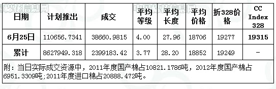 6月25日儲備棉投放數(shù)量為110656.7341噸,實際成交38660.9815噸,成交比例34.94%,較上一交易日升高6.93%,其中2011年度國產(chǎn)棉花成交10821.1786噸,2012年度國產(chǎn)棉花成交6951.3309噸,2011年度進口棉20888.472噸。當日成交儲備棉平均等級為4,較上一交易日降0.21;平均長度27.96,較上一交易日短0.18;加權成交價18706元/噸,較上一交易日降81元/噸;折328級成交價19277元/噸(公重),較前一交易日升高70元/噸,比當日CCIndex328價格低38元/噸。截止6月25日,累計上市總量8627949.3178噸,累計成交總量2399183.4201噸,總成交比例27.81%。其中進口棉累計成交372577.9469噸,5月6號至今累計成交進口棉260030.1967噸。