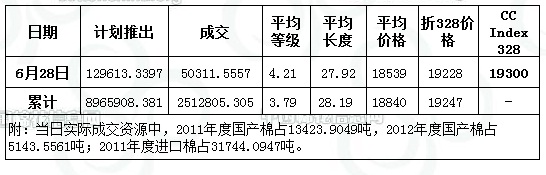 6月28日儲備棉投放數(shù)量為129613.3397噸,實際成交50311.5557噸,成交比例38.82%,較上一交易日升高8.75%,其中2011年度國產(chǎn)棉花成交13423.9049噸,2012年度國產(chǎn)棉花成交5143.5561噸,2011年度進(jìn)口棉31744.0947噸。當(dāng)日成交儲備棉平均等級為4.21,較上一交易日降0.2;平均長度27.92,較上一交易日短0.06;加權(quán)成交價18539元/噸,較上一交易日降49元/噸;折328級成交價19228元/噸(公重),較前一交易日升高72元/噸,比當(dāng)日CCIndex328價格低72元/噸。截止6月28日,累計上市總量8965908.3808噸,累計成交總量2512805.3045噸,總成交比例28.03%。其中進(jìn)口棉累計成交439896.8069噸,5月6號至今累計成交進(jìn)口棉327349.0567噸。