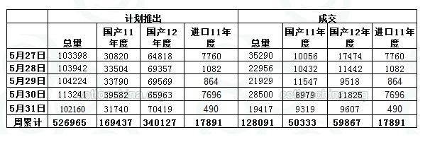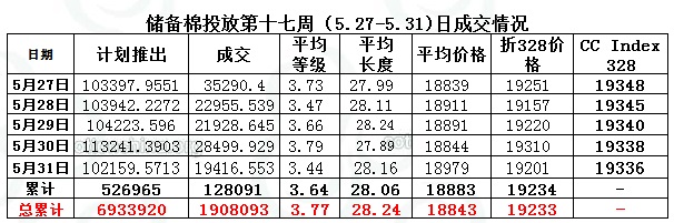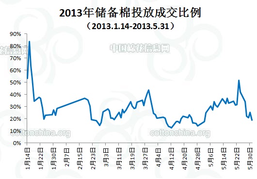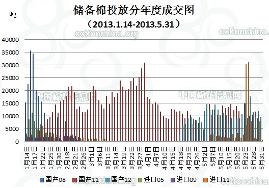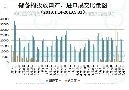 上周(5.27-5.31)累計投放儲備棉526965噸,實際成交128091噸,成交比例24.31%;當周成交儲備棉平均等級為3.64,平均長度28.06,加權(quán)成交價18883元/噸,折328級成交價19234元/噸(公重)。截止上周,2013年以來累計上市投放儲備棉6933920噸,累計成交總量1908093噸,成交比例27.52%。