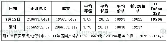 7月12日儲備棉投放數(shù)量為240633.8481噸,實際成交19563.6482噸,成交比例8.13%,較上一交易日上升5.03%,其中2011年度國產(chǎn)棉花成交1887.3567噸,2012年度國產(chǎn)棉花成交17676.2915噸。當日成交儲備棉平均等級為3.09,較上一交易日高0.19;平均長度28.12,較上一交易日短0.12;加權(quán)成交價18993元/噸,較上一交易日高89元/噸;折328級成交價19022元/噸(公重),較前一交易日高5元/噸,比當日CCIndex328價格低244元/噸。截止7月12日,累計上市總量11565932.59噸,累計成交總量2866113.112噸,總成交比例24.78%。其中進口棉累計成交578125.3955噸,5月6號至今累計成交2011年度進口棉466250.1829噸。