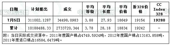 7月5日儲(chǔ)備棉投放數(shù)量為311002.1287噸,實(shí)際成交34498.0983噸,成交比例11.09%,較上一交易日下降2.75%,其中2011年度國(guó)產(chǎn)棉花成交4749.5924噸,2012年度國(guó)產(chǎn)棉花成交13163.858噸,2011年度進(jìn)口棉16584.6479噸。當(dāng)日成交儲(chǔ)備棉平均等級(jí)為3.88,較上一交易日降0.11;平均長(zhǎng)度27.93,較上一交易日降0.15;加權(quán)成交價(jià)18649元/噸,較上一交易日降110元/噸;折328級(jí)成交價(jià)19154元/噸(公重),較前一交易日降26元/噸,比當(dāng)日CCIndex328價(jià)格低126元/噸。截止7月5日,累計(jì)上市總量10188488.33噸,累計(jì)成交總量2733720.344噸,總成交比例26.83%。其中進(jìn)口棉累計(jì)成交529453.4692噸,5月6號(hào)至今累計(jì)成交2011年度進(jìn)口棉417578.2566噸。