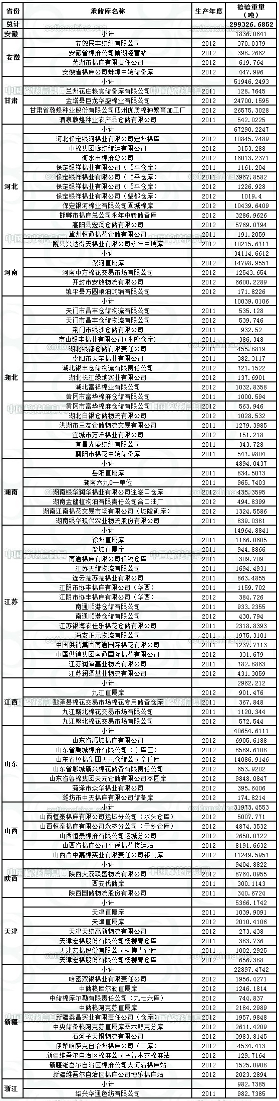 中國儲(chǔ)備棉管理總公司定于7月9日出庫銷售儲(chǔ)備299326.6852噸。其中,2011年度國產(chǎn)棉13039.0878噸,2012年度國產(chǎn)棉265908.4199噸,2011年度進(jìn)口棉20379.1775噸。相關(guān)批次公檢數(shù)據(jù)見附件。具體庫點(diǎn)如下: