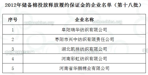 2012年儲(chǔ)備棉投放釋放履約保證金的企業(yè)名單(第十八批)