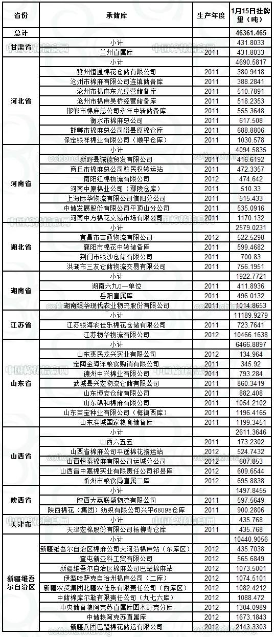 各紡織企業(yè): 定于1月15日出庫(kù)銷售儲(chǔ)備棉46361.465噸。其中2011年度國(guó)產(chǎn)棉21884.1254噸,2012年度國(guó)產(chǎn)棉(新標(biāo)準(zhǔn))24477.3396噸。今日無(wú)進(jìn)口棉。相關(guān)批次公檢數(shù)據(jù)見附件。具體庫(kù)點(diǎn)如下:
