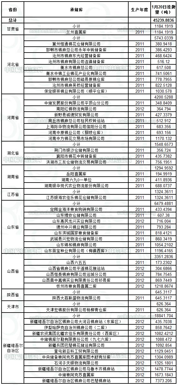 各紡織企業(yè): 定于1月20日出庫(kù)銷(xiāo)售儲(chǔ)備棉45239.8836噸。其中2011年度國(guó)產(chǎn)棉22139.3282噸,2012年度國(guó)產(chǎn)棉(新標(biāo)準(zhǔn))23100.5554噸。今日無(wú)進(jìn)口棉。相關(guān)批次公檢數(shù)據(jù)見(jiàn)附件。具體庫(kù)點(diǎn)如下: