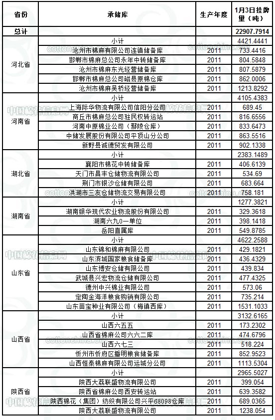 各紡織企業(yè): 定于1月3日出庫(kù)銷售儲(chǔ)備棉22907.7914噸。其中2011年度國(guó)產(chǎn)棉21376.6881噸,2011年度進(jìn)口棉1531.1033噸。相關(guān)批次公檢數(shù)據(jù)見附件。具體庫(kù)點(diǎn)如下: