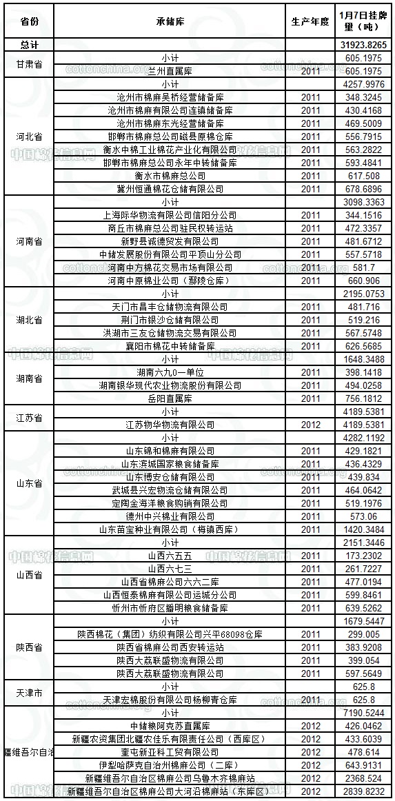 各紡織企業(yè): 定于1月7日出庫銷售儲備棉31923.8265噸。其中2011年度國產(chǎn)棉19123.4156噸,2012年度國產(chǎn)棉11380.0625噸,2011年度進口棉1420.3484噸。相關批次公檢數(shù)據(jù)見附件。具體庫點如下: