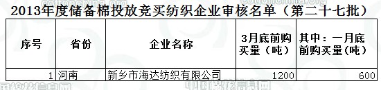 2013年度儲備棉投放競買紡織企業(yè)審核名單(第二十七批)