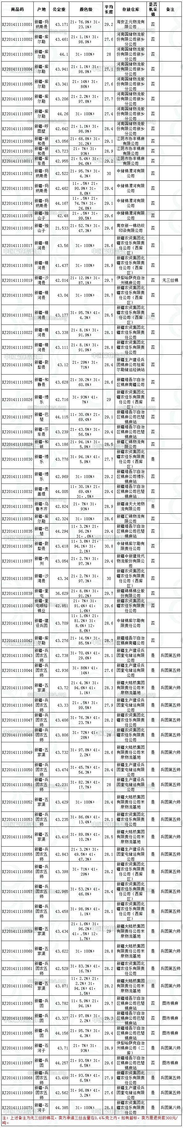各交易商: 全國棉花交易市場定于11月11日上市新疆棉競賣資源3002.421噸,其中新疆庫區(qū)資源2331.401噸(手摘棉1205.072噸,機采棉1126.329噸),內(nèi)含兵團棉1215.251噸;內(nèi)地庫區(qū)資源671.02噸(手摘棉671.02噸)。當(dāng)日競賣資源中有1批無三絲棉。賣方承諾每噸三絲含量在0.4‰克之內(nèi)。如有超標,賣方愿退貨款300元/噸。相關(guān)詳細數(shù)據(jù)見附件。具體庫點如下: