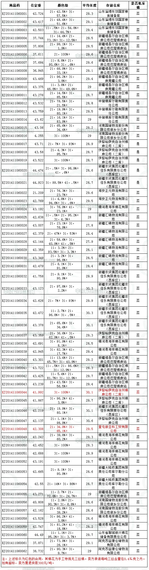 各交易商: 全國(guó)棉花交易市場(chǎng)定于11月6日推出新疆棉競(jìng)賣資源2566.473噸,其中新疆庫(kù)區(qū)資源2199.076噸(手摘棉1978.867噸,機(jī)采棉220.209噸);內(nèi)地庫(kù)區(qū)資源367.397噸(手摘棉367.397噸)。當(dāng)日總競(jìng)賣資源中有2批手工特挑無(wú)三絲棉。賣方承諾每噸三絲含量在0.4‰克之內(nèi)。如有超標(biāo),賣方愿退貨款300元/噸。相關(guān)詳細(xì)數(shù)據(jù)見附件。具體庫(kù)點(diǎn)如下: