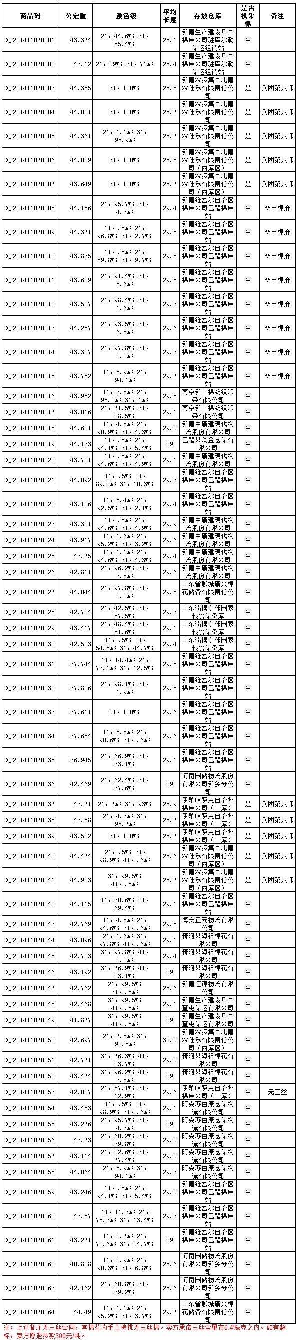各交易商: 全國(guó)棉花交易市場(chǎng)定于11月7日推出新疆棉競(jìng)賣資源2750.554噸,其中新疆庫(kù)區(qū)資源2278.17噸(手摘棉1837.536噸,機(jī)采棉440.634噸);內(nèi)地庫(kù)區(qū)資源472.384噸(手摘棉472.384噸)。當(dāng)日總競(jìng)賣資源中有1批無(wú)三絲棉。賣方承諾每噸三絲含量在0.4‰克之內(nèi)。如有超標(biāo),賣方愿退貨款300元/噸。相關(guān)詳細(xì)數(shù)據(jù)見(jiàn)附件。具體庫(kù)點(diǎn)如下: