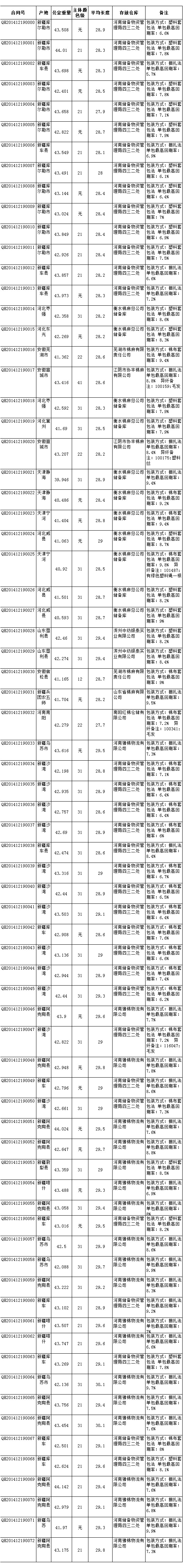 各交易商: 全國(guó)棉花交易市場(chǎng)定于12月19日推出期貨公檢棉競(jìng)賣資源3120.847噸。最低起拍價(jià)13500元/噸。相關(guān)詳細(xì)數(shù)據(jù)見附件。具體庫(kù)點(diǎn)如下: