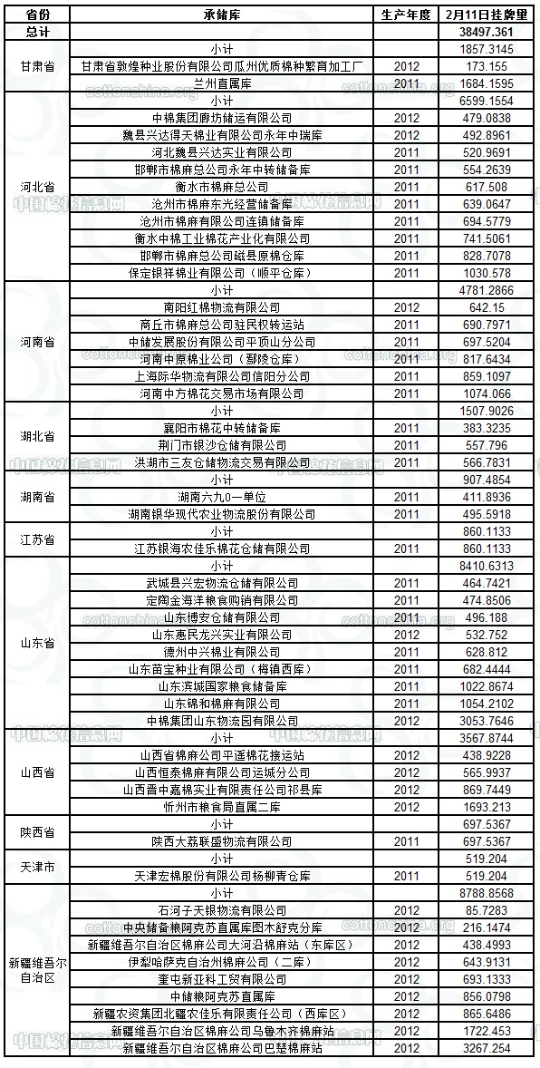 各紡織企業(yè): 定于2月11日出庫(kù)銷(xiāo)售儲(chǔ)備棉38497.361噸。其中2011年度國(guó)產(chǎn)棉20766.8283噸,2012年度國(guó)產(chǎn)棉(新標(biāo)準(zhǔn))17730.5327噸。今日無(wú)進(jìn)口棉。相關(guān)批次公檢數(shù)據(jù)見(jiàn)附件。具體庫(kù)點(diǎn)如下: