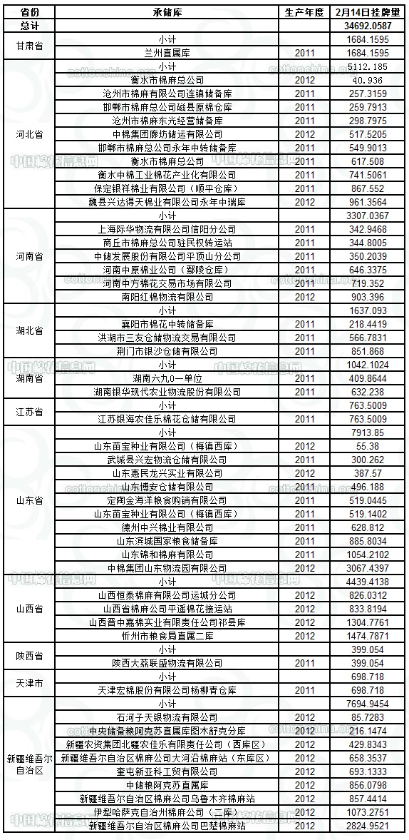 各紡織企業(yè): 定于2月14日出庫(kù)銷售儲(chǔ)備棉34692.0587噸。其中2011年度國(guó)產(chǎn)棉16624.1009噸,2012年度國(guó)產(chǎn)棉(新標(biāo)準(zhǔn))18067.9578噸。今日無(wú)進(jìn)口棉。相關(guān)批次公檢數(shù)據(jù)見(jiàn)附件。具體庫(kù)點(diǎn)如下: