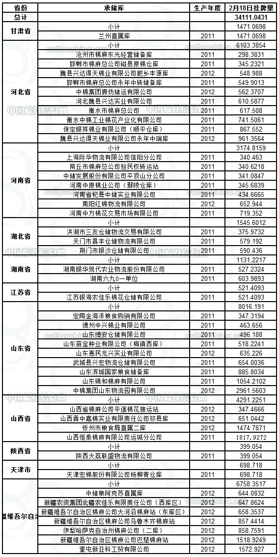 各紡織企業(yè): 定于2月18日出庫銷售儲備棉34111.0431噸。其中2011年度國產(chǎn)棉18556.9481噸,2012年度國產(chǎn)棉(新標(biāo)準(zhǔn))15854.095噸。今日無進(jìn)口棉。相關(guān)批次公檢數(shù)據(jù)見附件。具體庫點如下: