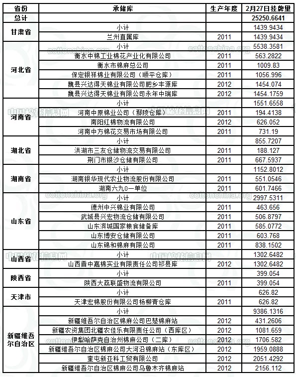 定于2月27日出庫銷售儲備棉25250.6641噸。其中2011年度國產(chǎn)棉11027.5824噸,2012年度國產(chǎn)棉(新標(biāo)準(zhǔn))14223.0817噸。今日無進(jìn)口棉。相關(guān)批次公檢數(shù)據(jù)見附件。具體庫點(diǎn)如下: