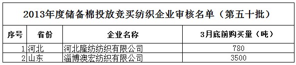 2013年度儲(chǔ)備棉投放競(jìng)買紡織企業(yè)審核名單(第五十批)