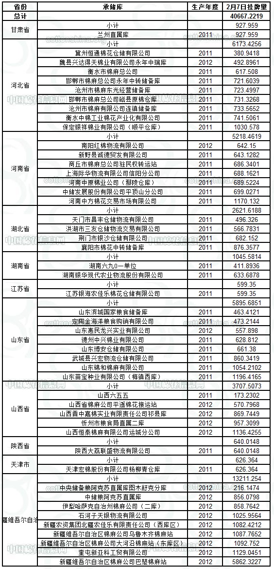 各紡織企業(yè): 定于2月7日出庫(kù)銷售儲(chǔ)備棉40667.2219噸。其中2011年度國(guó)產(chǎn)棉22228.7467噸,2012年度國(guó)產(chǎn)棉(新標(biāo)準(zhǔn))18438.4752噸。今日無(wú)進(jìn)口棉。相關(guān)批次公檢數(shù)據(jù)見(jiàn)附件。具體庫(kù)點(diǎn)如下: