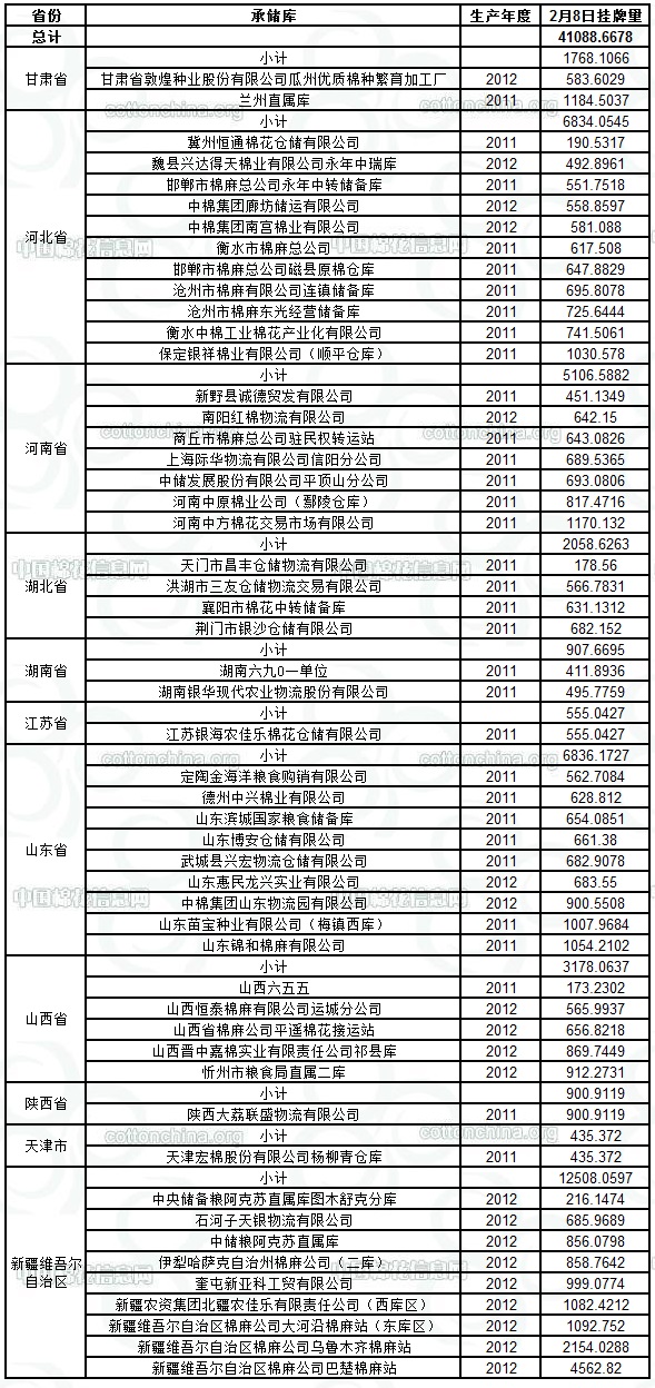 各紡織企業(yè): 定于2月8日出庫銷售儲備棉41088.6678噸。其中2011年度國產棉21133.0771噸,2012年度國產棉(新標準)19955.5907噸。今日無進口棉。相關批次公檢數(shù)據(jù)見附件。具體庫點如下: