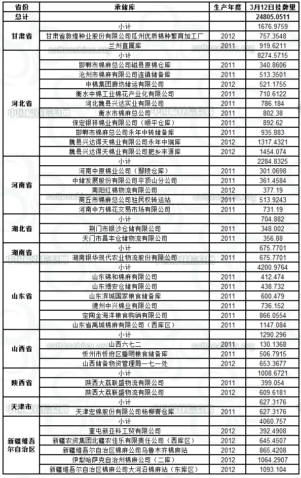 各紡織企業(yè): 定于3月12日出庫銷售儲備棉24805.0511噸。其中2011年度國產(chǎn)棉15054.0819噸,2012年度國產(chǎn)棉(新標(biāo)準(zhǔn))9750.9692噸。今日無進口棉。相關(guān)批次公檢數(shù)據(jù)見附件。具體庫點如下: